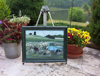 I just finished a painting for my husband’s birthday that I wanted to share with you. For special occasions I do a painting for his office. Usually they are of scenes from our farm or community. This painting was done from a photo I took last summer in our small town. There was a broken down truck parked in a field and the bed of it was filled with elderberry flowers and it was surrounded by Queen Anne’s lace. I loved the faded blue color. What could have been an eyesore was transformed into a quaint summer scene.